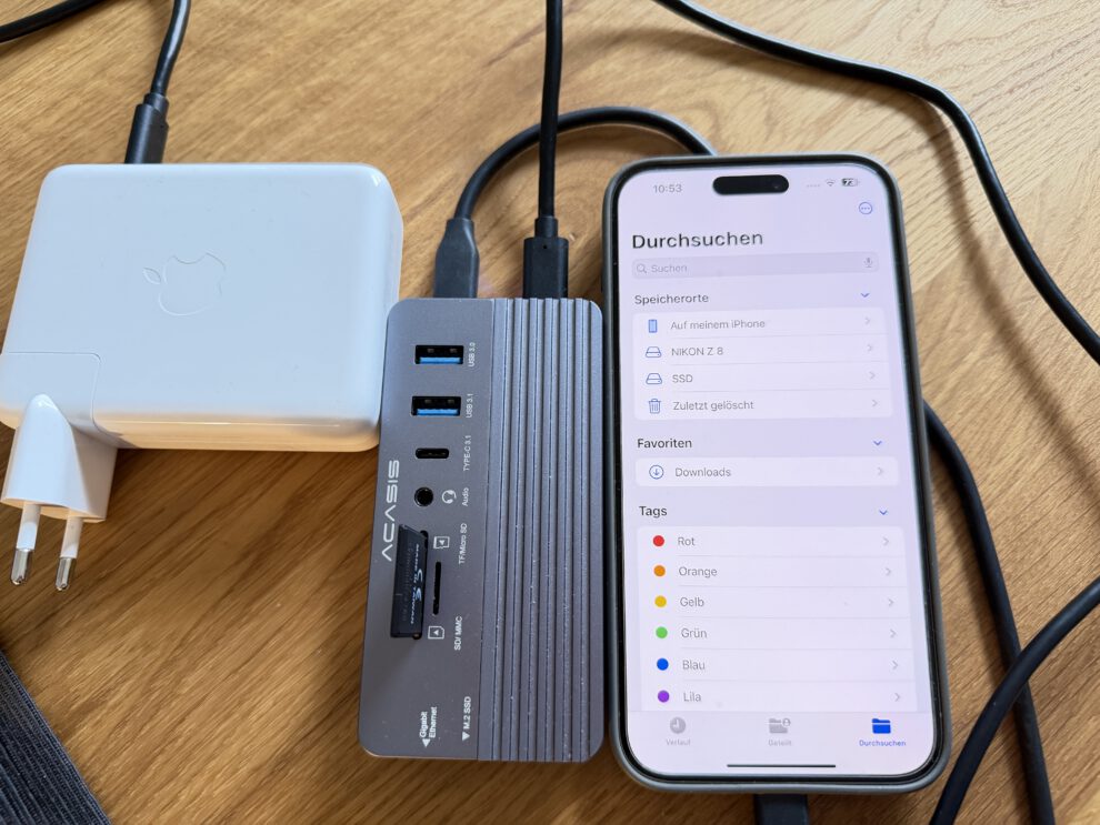 Mit dem Hub können SD und Mikro-SD gelesen werden. Hat man andere Speicherkarten kann man einen dedizierten Kartenleser über die USB Ports verbinden. Ich verwende in dem Hub eine 1TB große SSD. Über ein USB Datenkabel verbinde ich den Hub mit, in meinem Fall, dem iPhone. Über die App “Dateien” kann ich die Speicherkarte anwählen und den sich darauf befindlichen Ordner mit den Bildern kopieren und auf die SSD übertragen.